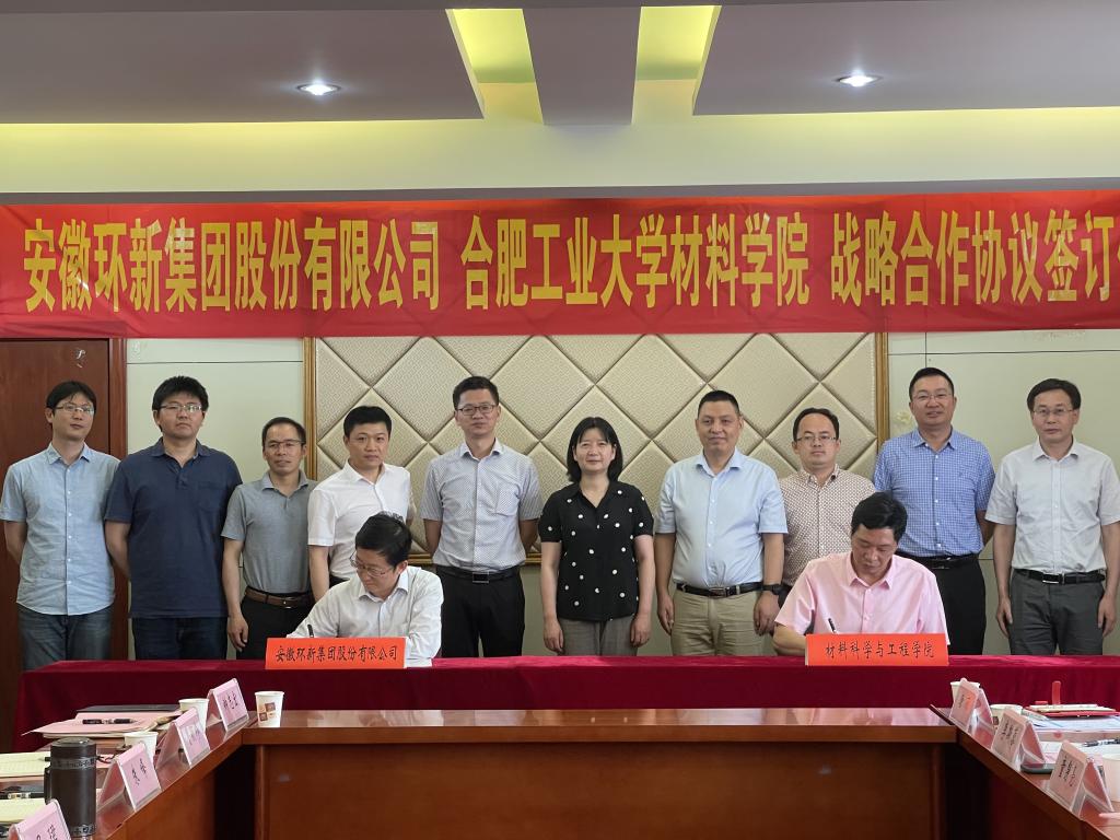与安徽环新集团股份有限公司战略合作协议签约仪式在材料楼三楼多功能厅举行。环新集团副总经理刘铜庆、人事总监吴镇海,材料学院领导班子全体成员参加仪式。仪式由材料学院党委书记吕珺主持。