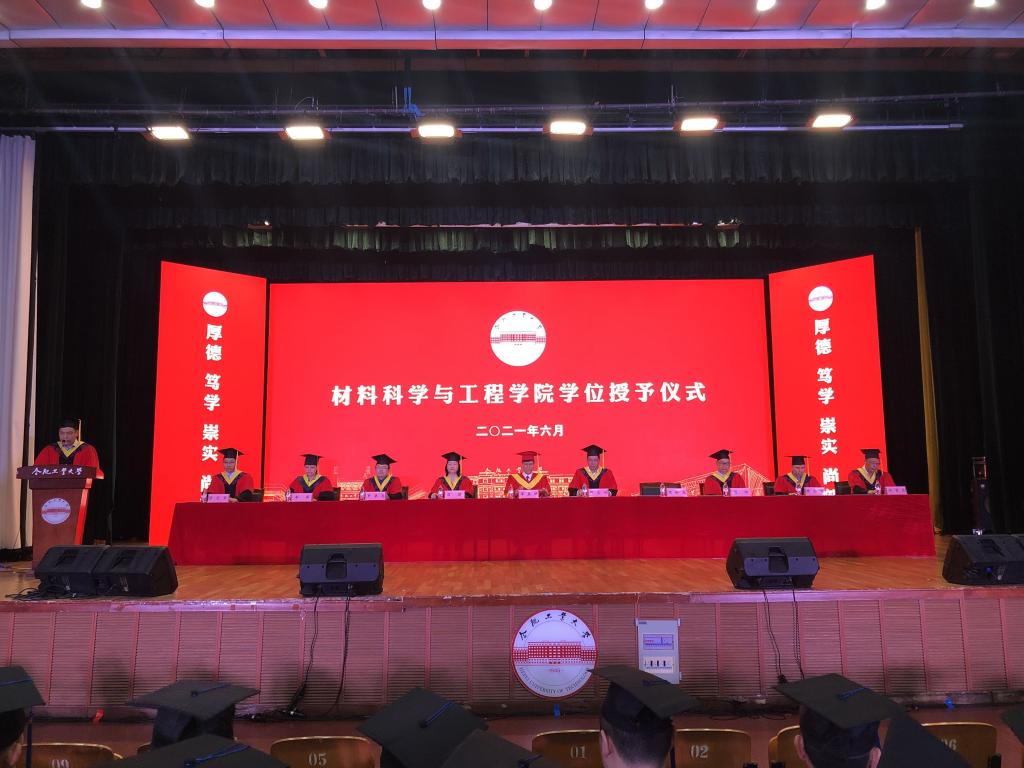 关于授予2021届毕业生学位的决定》,授予卫陈龙等8名博士研究生博士学位、肖广顺等144名硕士研究生硕士学位、余秋君等305名本科生学士学位。随后,主席台领导、老师为获得学位的全体学生颁发学位证书、扶正流苏,并与毕业生合影留念。