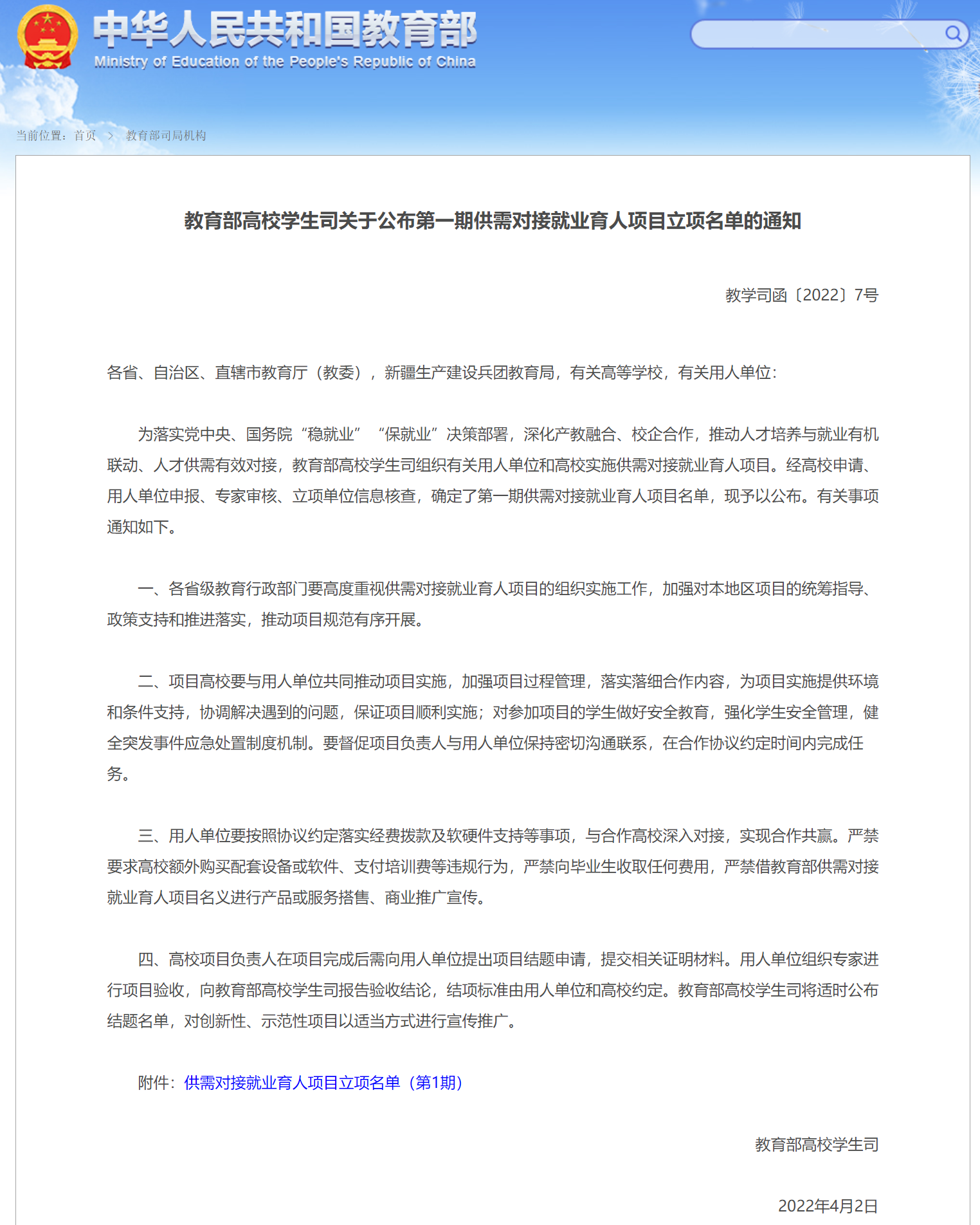 近日,教育部发布《教育部高校学生司关于公布第一期供需对接就业育人项目立项名单的通知》(教学司函〔2022〕7号),水果派解说