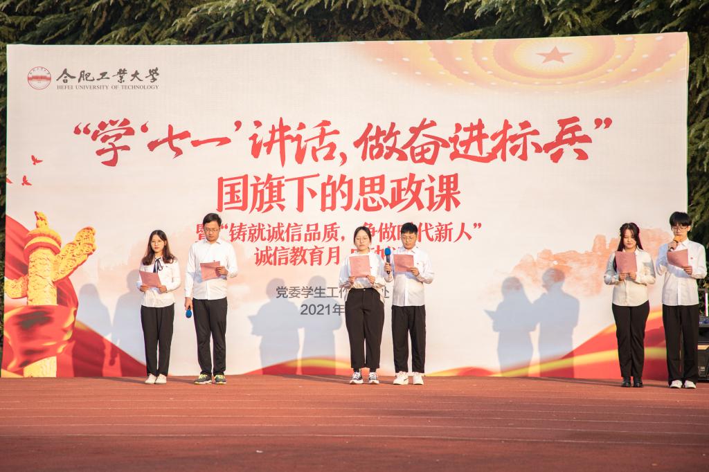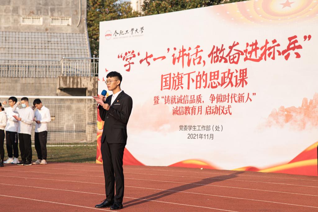 随后,学院2020-21学年国家奖学金获得者材料成19-2班王国强同学做国旗下的思政课《学习习近平总书记“七一”重要讲话精神,传承红色基因做新时代工大有为青年》主题演讲,王国强同学以习近平总书记在七一讲话中深情寄语新时代的中国青年以“实现中华民族伟大复兴为己任,增强做中国人的志气、骨气、底气,不负时代,不负韶华,不负党和人民的殷切期望”为主题,呼吁全体学子学习专业知识和党史,增强专业本领,努力做社会主义合格建设者和可靠接班人。王国强领誓全体同学“铸就诚信品质,争做时代新人”致材料学院全体学生承诺书,在场学生跟读,势如长虹。