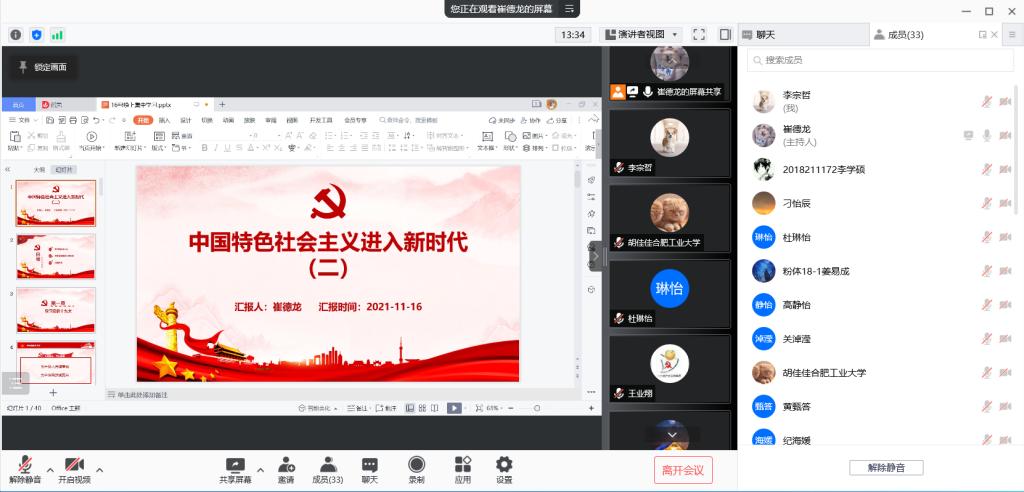 11月16日晚,材料学院本科生第三党支部通过线上腾讯会议方式开展“党的十九大和确立习近平新时代中国特色社会主义思想为党的指导思想、决胜全面建成小康社会”党史主题集中学习活动。本次活动由预备党员崔德龙同志主持并进行党史授课,第三党支部全体成员(含预备党员)参加活动。