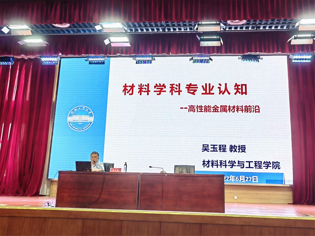报告会上,吴玉程以《材料学科的专业认知——高性能金属材料关键制备技术与应用前景》为题,围绕学院“锻造一流材料,培育一流人才”的人才培养目标,就材料学科发展情况、材料学院发展史、学院人才培养和团队平台建设等方面进行详细介绍。他指出,材料是人类社会发展的基石,人类社会的进步始终伴随着材料技术的突飞猛进。他以先进钨基粉体批量化制备关键技术研究为例,为同学们讲授了新技术变革为材料学科带来的机遇,鼓励同学们顺应时代发展的需求,勇于实践、敢于突破、善于创新,用自己的专业知识和专业能力,在材料领域创造属于自己一番天地。