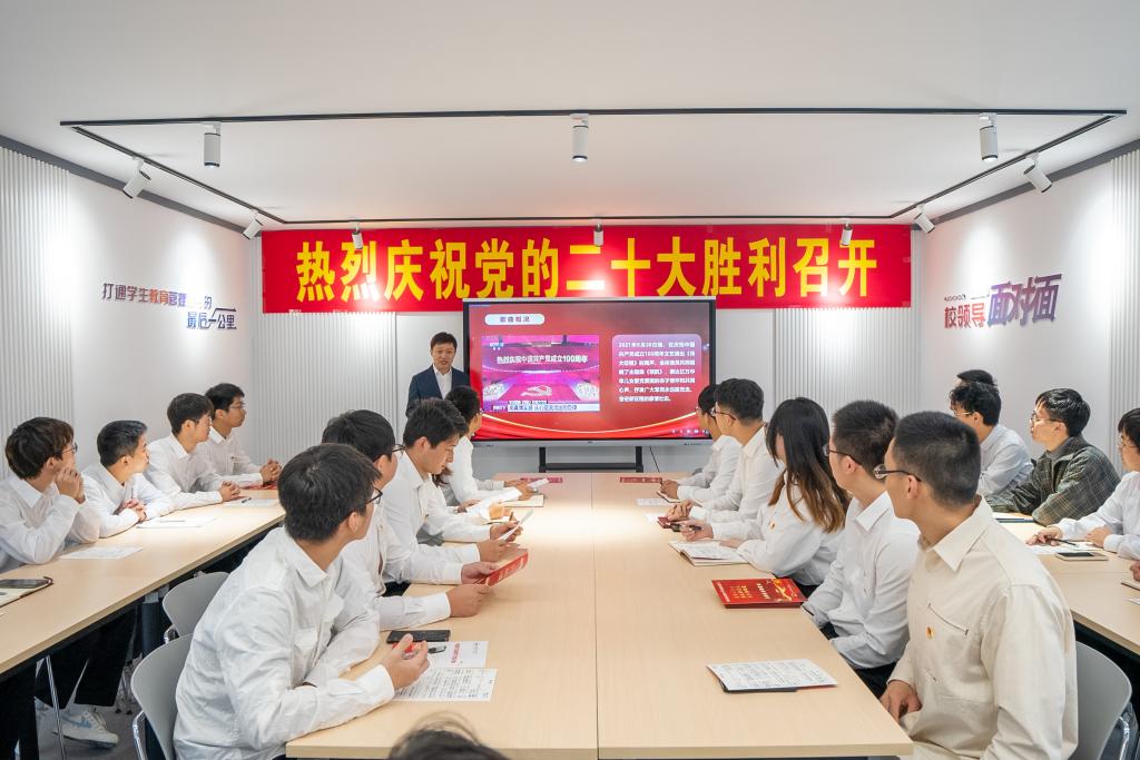 党委副书记兼纪委书记朱峰为同学们上了一堂生动的互动音乐微党课,详细介绍了《领航》的创作背景、歌词含义、韵律节拍,并带领全体同学齐声歌唱,将爱党爱国的细腻情感融入歌曲激奋高昂的旋律之中,勾勒出一幅百年党史的恢弘画卷。期间,同学们还共同欣赏了《领航》的现场演出,厚植了爱党爱国的赤子情怀,激发了永远跟党走、奋进新征程的豪情壮志。活动结束后,全体同学共同观看了党的二十大开幕会盛况。
