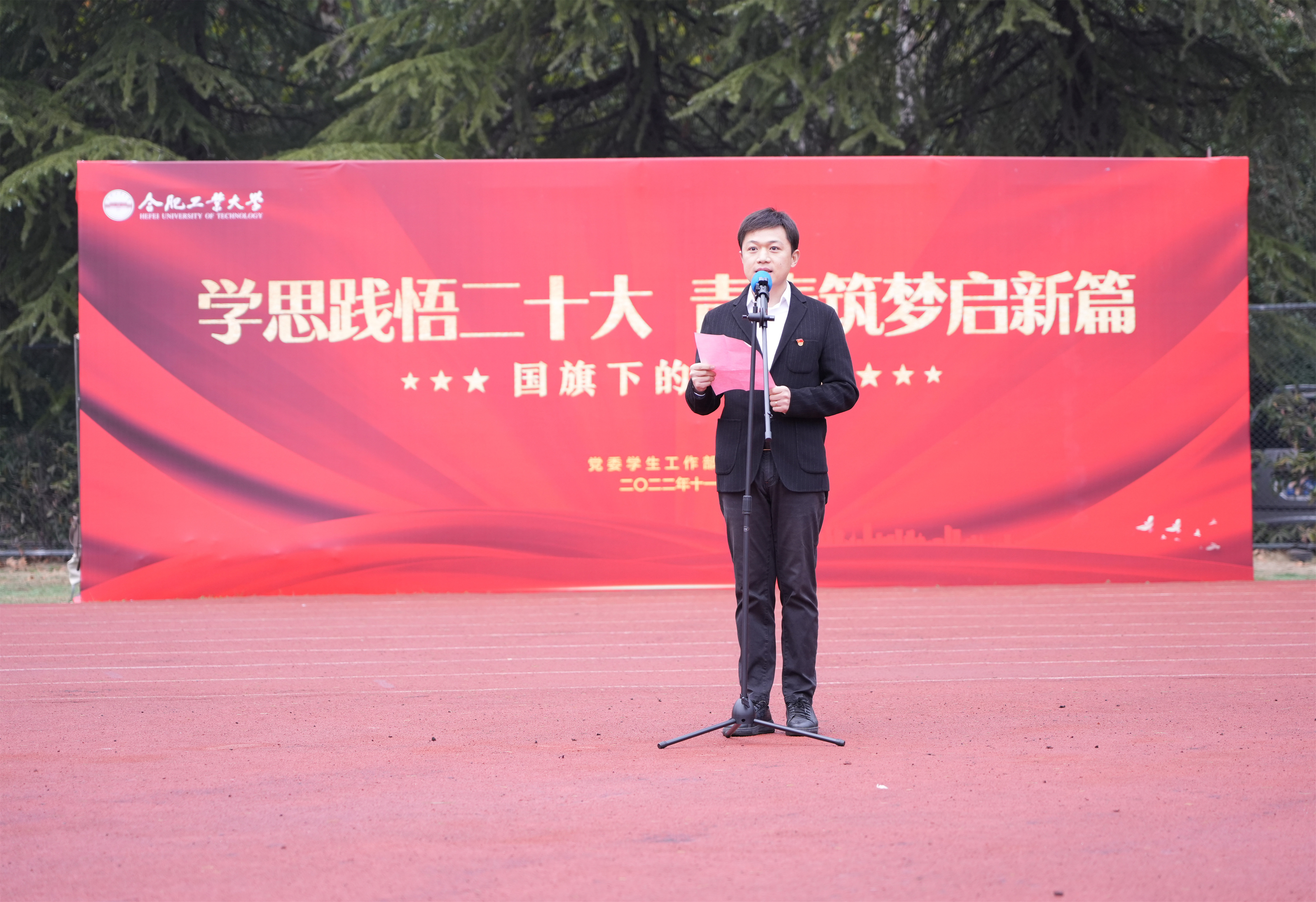 11月14日清晨,水果派解说 在屯溪路校区举行了以“学思践悟二十大 青春筑梦启新篇”为主题的升旗仪式暨国旗下的思政课主题教育活动。学院相关负责人、2019级、2020级全体本科生和研究生参加活动。