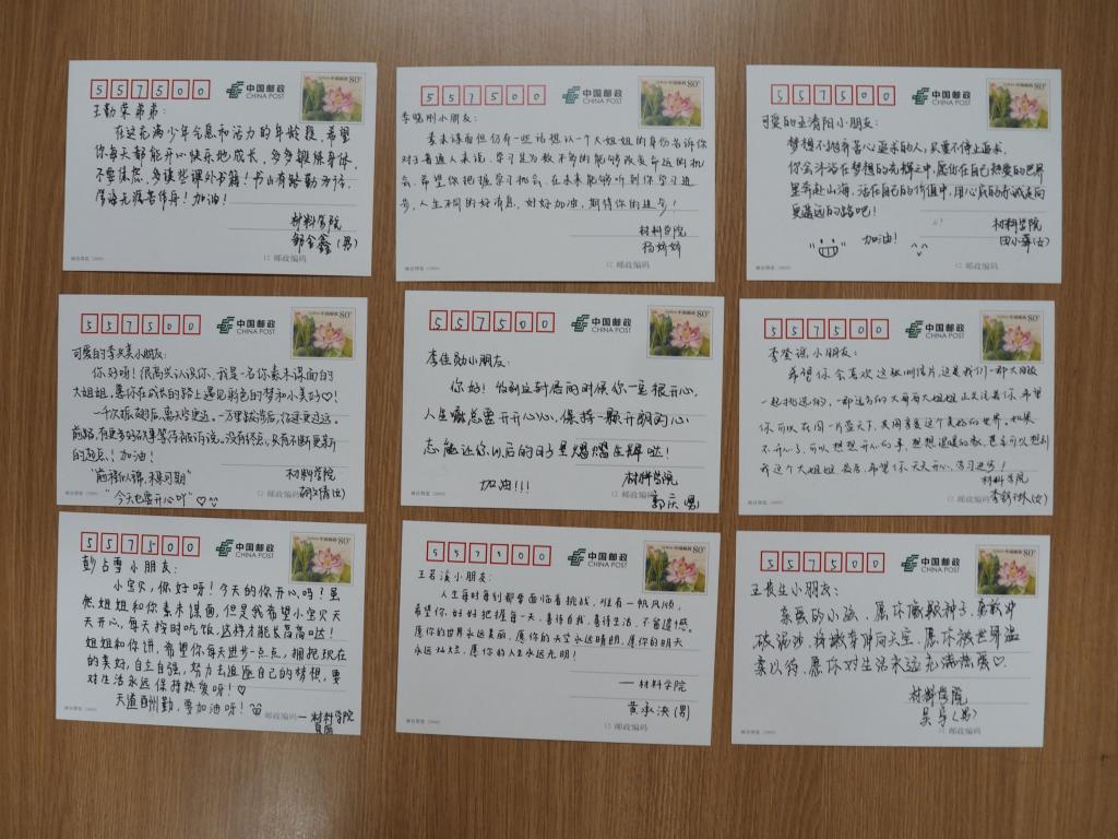 4月13日,学院研究生会成员和材物化研究生党支部的党员们齐聚材料学院小红楼103,为长青第二小学五年级(2)班的27名小学生精心挑选水果派解说 主题的明信片,并认真书写了对孩子们想说的话,为孩子们送去美好的祝福。有的同学们讲述了最近学习生活中的趣事,有的同学描绘了工大校园的美丽景色,有的同学分享了大学生活的美好……在明信片的最后,大家不约而同地写下了对丹寨孩子们的鼓励与祝福,希望他们能够健康快乐地成长。此外,学院还为山区小朋友们准备了学习工具大礼包,在精神上给予鼓励的同时,也为小朋友们送上最需要的物资,帮助他们更好的求学与成长!