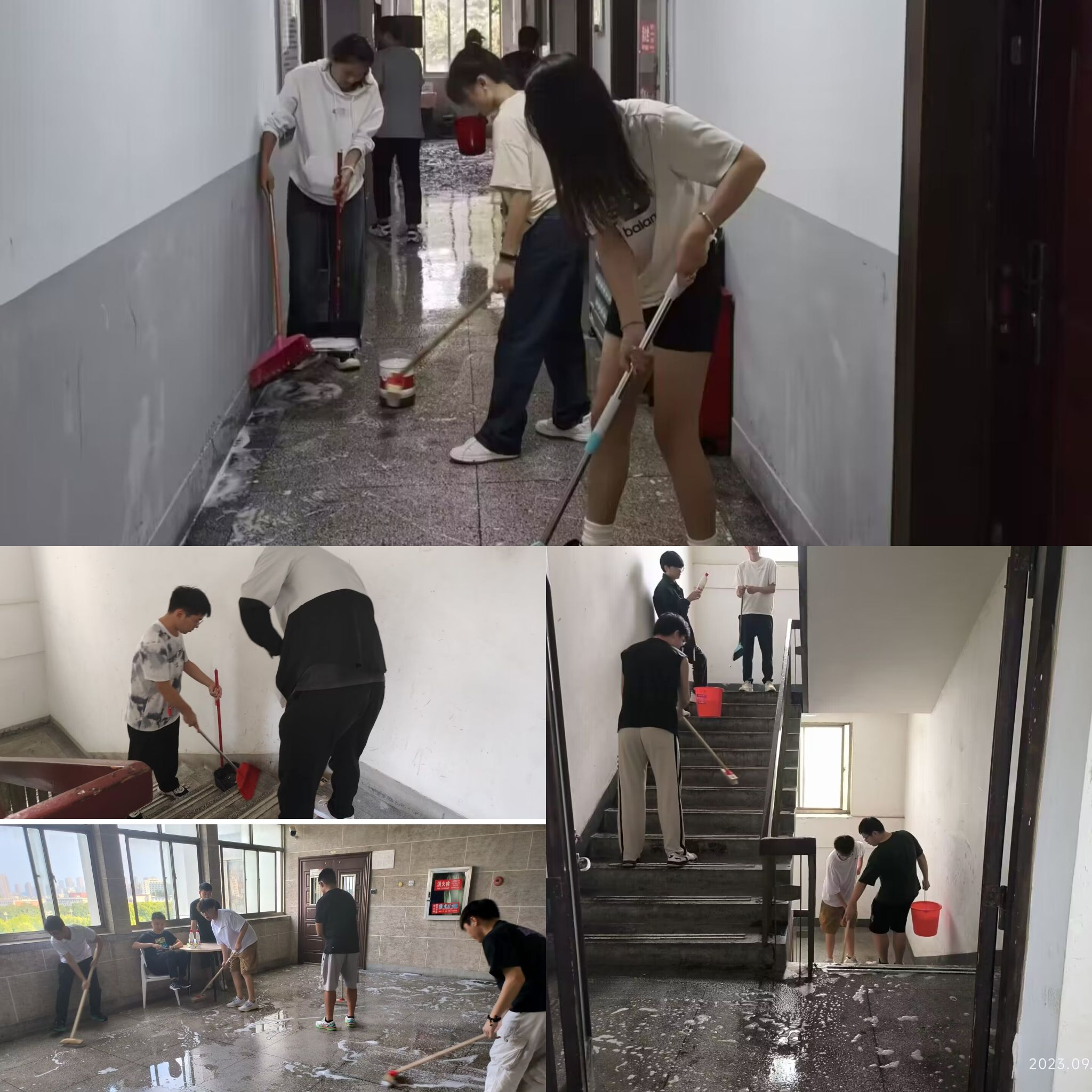 活动现场,在各组组长的统筹安排下,小组成员有序领取卫生工具,陆续完成负责区域卫生。在确保安全的前提下,大家各司其职、干劲十足,用扫把、拖把认真清理地面灰尘、垃圾以及窗台杂物。经过大家的合力清理,材料楼过道、楼梯间、电梯里干净整洁、舒适有序,该劳动成果获得一致好评。