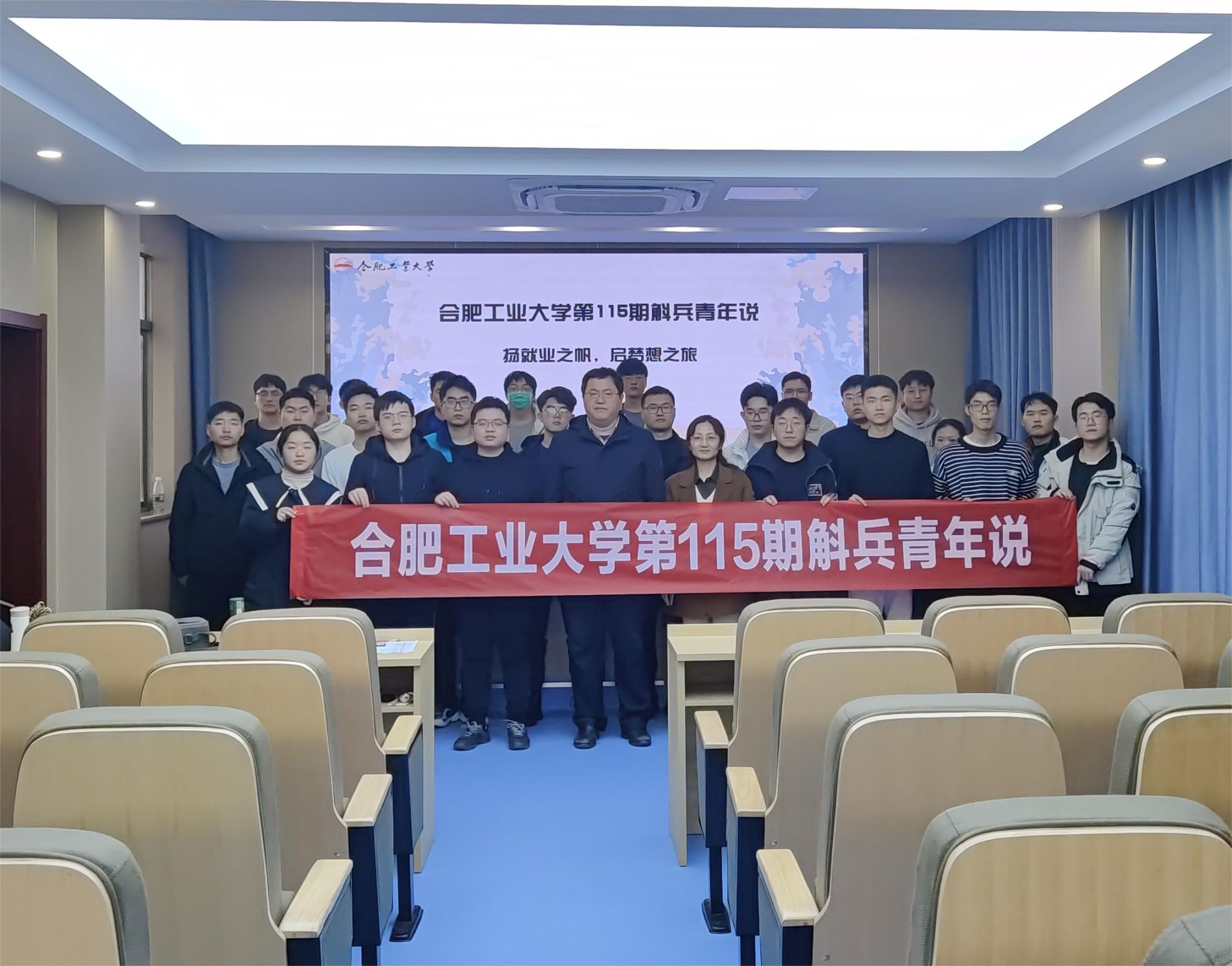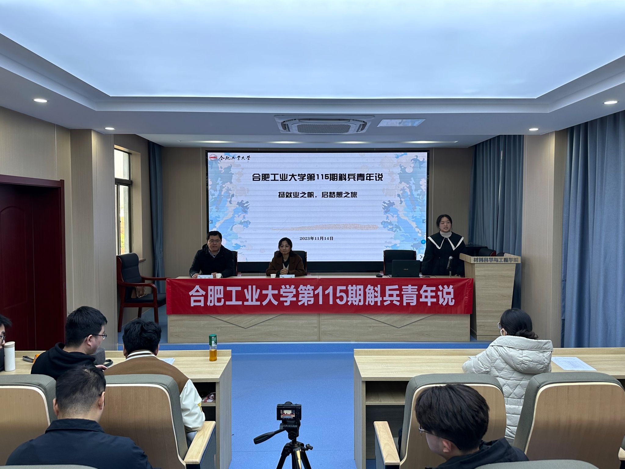 11月14日下午,在材料楼601报告厅成功举办学校第115期斛兵青年说——职场经验分享交流活动,本期交流活动材料学院主办,活动的主题为:“扬就业之帆,启梦想之旅”,活动邀请优秀校友张迪和赵永征作职场经验分享。