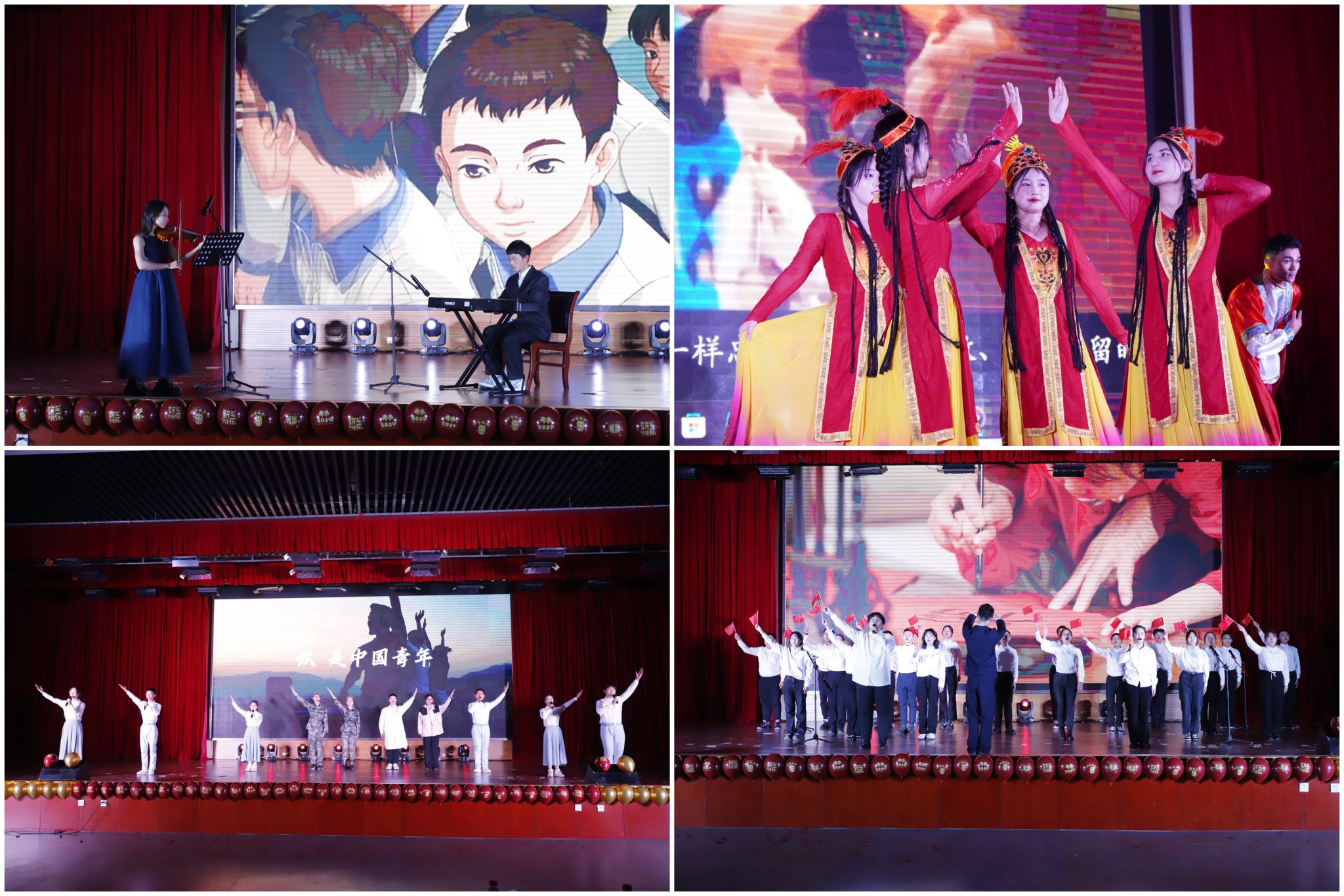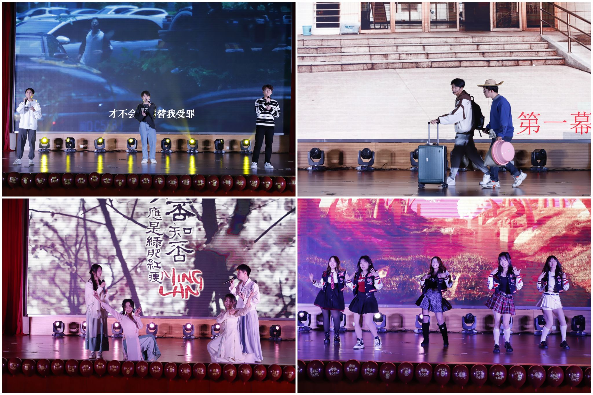 材料学院元旦迎新晚会在歌曲串烧《忆青春》中拉开序幕,四位同学优美的歌声演绎了《晴天》、《我是如此相信》、《七里香》,开篇将现场观众的思绪拉回了美好的青春时代。晚会共分为“青春成长”、“校园生活”、“时代青年”三个篇章,演员们用自己自信的歌声、优美的舞姿、生动的演技,展现了青年大学生的朝气蓬勃的生机,昂扬向上的态度和爱党爱国的浓厚情怀。