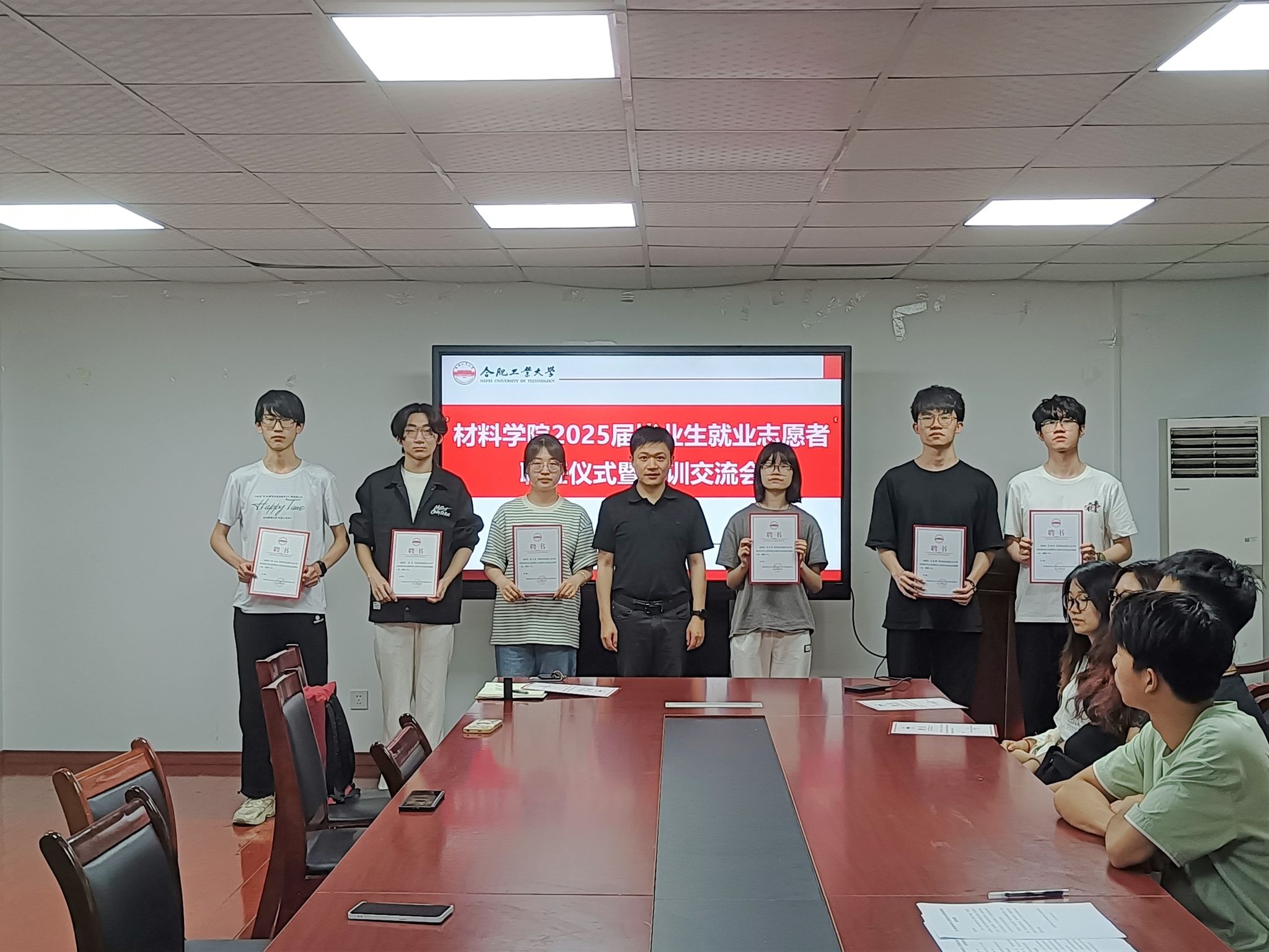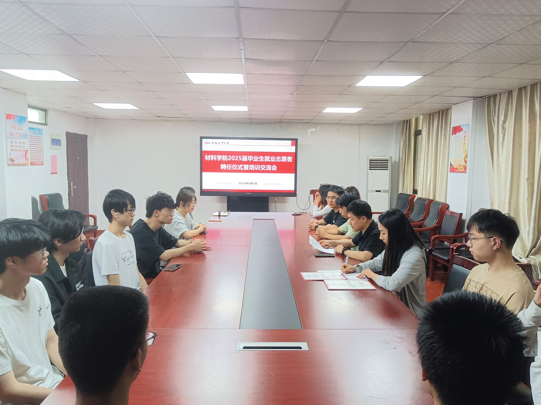 在材料楼党员之家举办2025届毕业生就业志愿者聘任仪式暨培训交流会。学院相关负责人、2025届毕业班辅导员和全体就业志愿者参会。