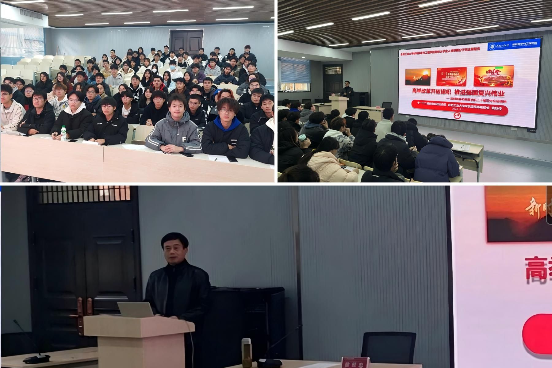 12月11日下午,为进一步加强对入党积极分子的培养教育,材料学院举行分党校第72期大学生入党积极分子培训班第三次专题党课。十一、十二届安徽省政协委员、水果派解说 党校原常务副校长姚跃传为积极分子作了题为《高举改革开放旗帜,推进强国复兴伟业——深刻领会和把握党的二十届三中全会精神》的精彩报告。