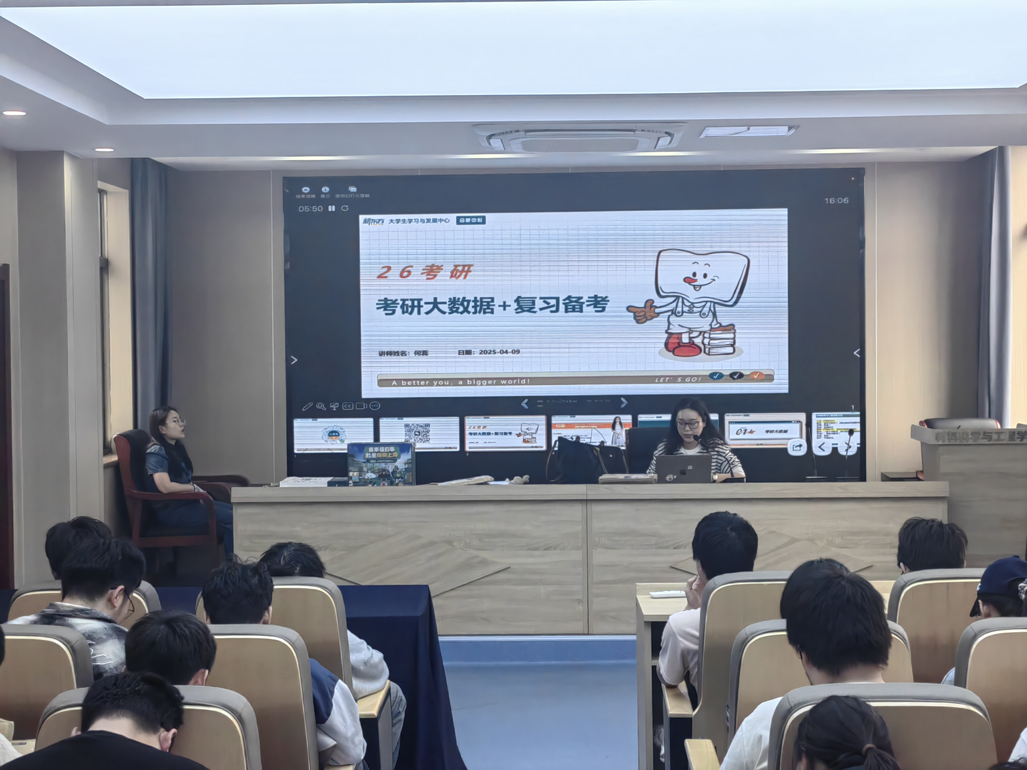 为帮助学院2026届考研学子制定科学合理的备考、冲刺计划,进一步掌握解题应试与冲刺提分技巧,提高复习效率。近日,材料学院邀请新东方合肥中心产品经理何蕊,为考研学子开展考研择校及英语备考指导讲座。讲座围绕全国考研大数据分析、择校择专业策略、学科复习经验等核心内容展开,帮助同学们更科学地规划考研择校、复习等问题。学院2026届70余名本科生同学参与了此次讲座。