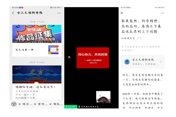 疫情防控期间,材料学院在校党委的坚强领导下,始终以高度的责任心和使命感做好学生工作,用心引导、用情关爱、用力推进,在全力保障学生生命安全和身体健康的基础上,做到各项工作不断线,用实际行动叩问初心使命,践行责任担当。