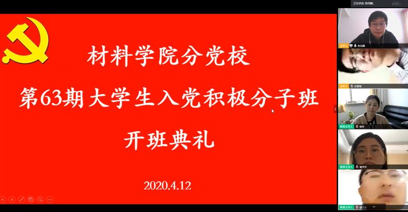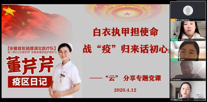 在全国上下共同抗击新冠疫情的关键时期,为深入学习习近平总书记给北京大学援鄂医疗队“90后”党员的回信精神,学习抗疫精神,讲好抗疫故事,以榜样人物和事迹教育引导广大青年学生树立新时代的爱国情怀,4月12日下午,材料学院以共抗疫情、爱国力行为主题,组织了一场特别的党校开班仪式,邀请了安徽省首批援鄂医疗队队员、安徽省向上向善好青年、安徽省江淮护理之星、合肥市三八红旗手、省首批援鄂医疗队队员、安徽省第二人民医院重症医学科主管护师、董芹芹担任主讲老师,以“白衣执甲担使命,战‘疫’归来话初心” 为题,给学生们进行了一场生动的党性和思政教育大课。学院相关负责人、辅导员和第63期积极分子班全体学员和部分学生党团骨干、学生代表等共计120余人隔空集合,共同聆听交流。