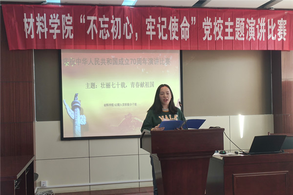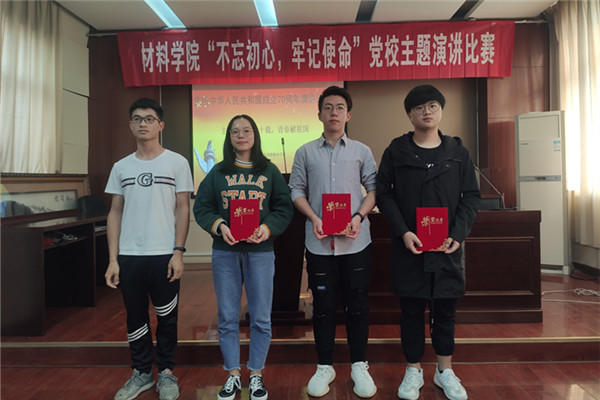 活动伊始,主持人向现场的10组选手宣读了评分标准。之后,参赛的选手依次上台,透过文字和慷慨激昂的演讲表达了对祖国最真切的告白。比赛过程中,选手们声情并茂,用最真诚的话语讲述着祖国七十年的发展,用最饱满的情感谱写着对祖国的颂歌。“我们是伟大时代的接班人,血液里流淌的是自豪与责任”,“70年来中国的进步腾飞在世界,腾飞在每一个中国人的心中”,选手的演讲或慷慨激昂,或深情婉转,都深刻的表达了材料学子对祖国的满腔热忱,道出了中国人对祖国的深厚情感。最后,任雨航、余祖希同学分别荣获一等奖;吴晓彤、卢旭博、刘襄萍同学分别荣获二等奖;叶鹏、柴蓉、王迪、张跃奇、李梦同学分别荣获三等奖;