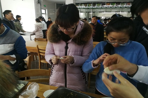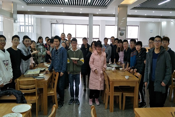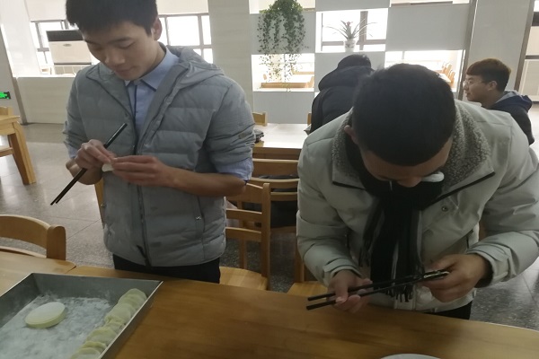 当天早上,天还蒙蒙亮的时候,两班的团支书便已经冒着凛冽的寒风,踏上了寻找食材的征途,给同学们早早的预备好了馅料与饺子皮,为活动做足了准备。下午一点,活动准时开始。食堂阿姨刚把材料端上来,同学们便迫不及待地撸起袖子开始包饺子。学弟学妹们与学长学姐围在桌子旁边,老手们指导着第一次包饺子的新手,熟练的同学便去帮忙擀饺子皮。大家分工明确,有说有笑。同学们还各显神通,元宝形的饺子、蝴蝶型的饺子、花褶边的包子纷纷出现在碟中,其乐融融的景象还吸引了食堂经理前来参观,直夸我们饺子包的漂亮。在同学们齐心努力下,四大碟饺子也排队下了锅。配上食堂为我们准备的醋与酱油,同学们在腾腾的热气中品尝了自己亲手包的饺子,掺杂着劳动与合作的饺子仿佛也变得更加美味。