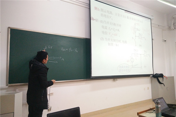 “如果规定电位降取正号,则点位升就取负号……”来自材料成型17-2班的唐天宇同学在讲台上认真讲解《电工电子技术》第一章的相关知识。讲台下,自发前来听课的同学认真地听讲并做着记录,不时的还有同学提问,唐天宇也总是给予耐心的解答和讲解。