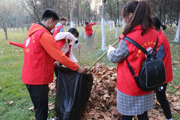 到达了清扫区域后,志愿者们以三人一组的形式进行了简单分工,迅速地确定了各小组的成员及清扫区域。志愿者们有的负责清扫落叶、有的相互配合将落叶装袋,一堆堆的落叶不一会填满了一个个编织袋。经过两个小时的奋力清扫,地上的落叶很快被清理的干干净净,公园的道路恢复了原有的整洁面貌。汗水滑下了志愿者们的脸颊,但他们脸上都洋溢着灿烂的笑容。