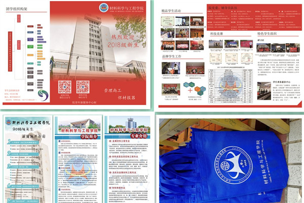 海报以院徽作为水印制作于海报正中央,海报版头以翡翠湖校区南门作为背景图片,凸显学校主体地位。专业介绍海报以组成材料的球棍分子模型作为水印,海报版头以材料楼为背景图片,强化专业认同。为展现材料学院精品学生活动、品牌学生工作、特色学生组织和科技竞赛情况,院青年新媒体中心为学院每一位新生“私人订制”了带有学院特色的迎新专刊折页,折页封面以材料楼作为主图片,以主教楼砖红色作为主基调,学生组织构架版块制作院徽水印,强化学院自信,封面底脚和内页分别印制了学院院训和“双引领三融合”学生工作育人理念。