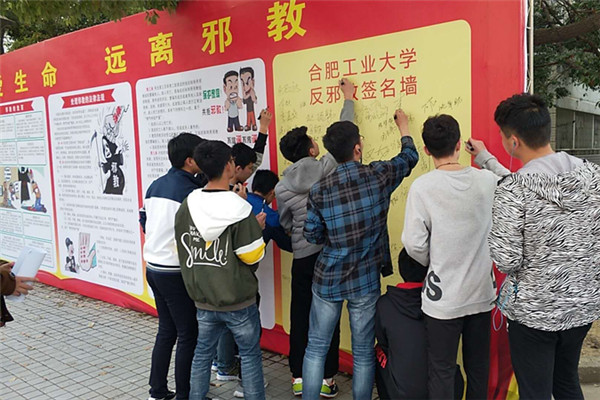 活动现场,保卫处工作人员首先通过巨幅宣传海报向同学们讲解了邪教的性质、危害及相关处理法律法规等知识,随后就识邪、防邪、反邪等方面知识做了详细的讲解,并针对部分同学的疑惑接受了同学们的现场咨询。最后,在工作人员的倡议下同学们纷纷自发在反邪教签名墙上签下了自己的名字。