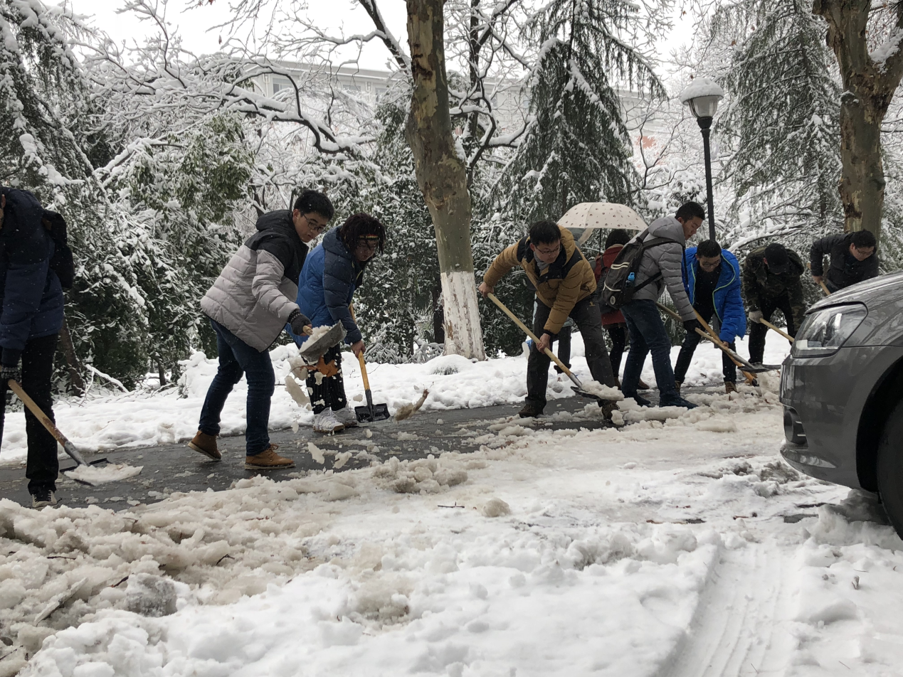 新年伊始,合肥迎来强降雪,工大校园内积雪深厚,严重影响师生出行。雪后第二天,材料学院2015级本科生党支部的学生组成志愿小分队,从行政楼借来工具,火速加入到除雪队伍中去。所有学生分成两组,分别从至善路的两端开始除雪,将路中间的雪堆积到道路两旁,并将停车位前的积雪堆到不妨碍车辆进出的位置。辅导员周矗老师身先士卒,同学生一起劳动,在冰冷的雪地里,同学们丝毫没有怠慢的情绪。经过一个半小时的努力,至善路已经可以正常通车行走。