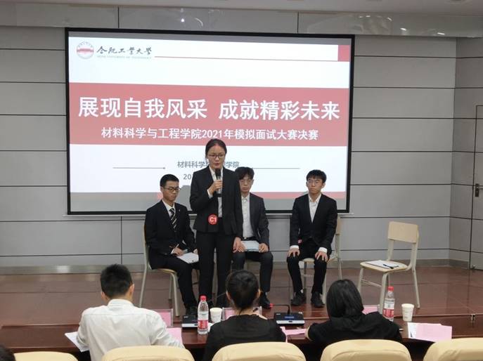 比赛特邀维信诺集团人力资源中心、美的集团冰箱事业部HRBP Leader等专家担任评委。本次大赛分为读研深造组和就业组两个组别,共征集简历320余份,近300人参与一轮面试环节。经简历征集、面试初筛,分别在就业组中的专业技术岗、销售经营岗、企业管理岗各筛选出4名选手参加决赛。决赛中,针对不同岗位工作性质不同,分别设置情景问答考核模式、1对1PK竞答模式、无领导小组讨论模式。全仿真的面试场景让参赛选手快速进入状态,同学们服装礼仪得体、思维敏捷、表达清晰,令在场评委及观众印象深刻。