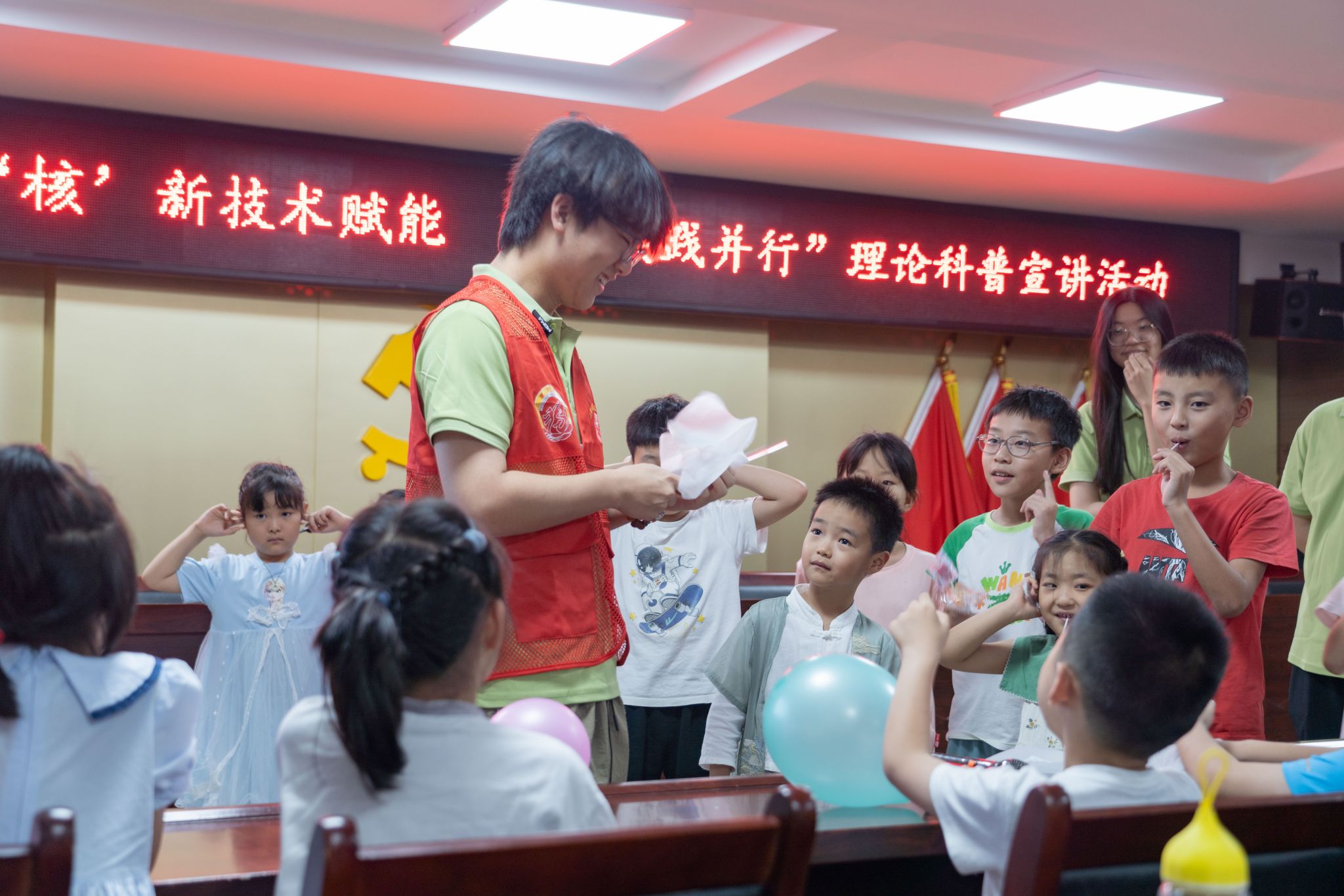 课程结束后,实践团队设计了一系列趣味实验,通过耐心而细致地讲解实验步骤,指导小朋友们参与其中,更生动地让孩子们感受到核裂变、核聚变的神奇之处,理解核的相关知识和应用。