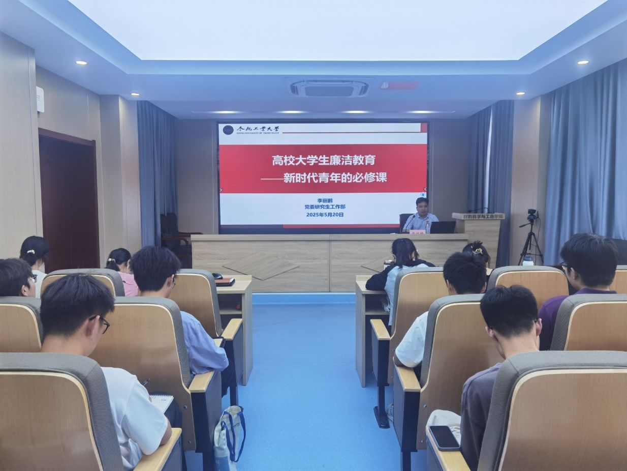 在屯溪路校区材料楼601报告厅举办大学生廉洁教育专题党课。党委研究生工作部部长李丽鹏应邀授课。学院全国“样板支部”学生代表、党校第73期学员班学生代表等70余人参加本次党课。