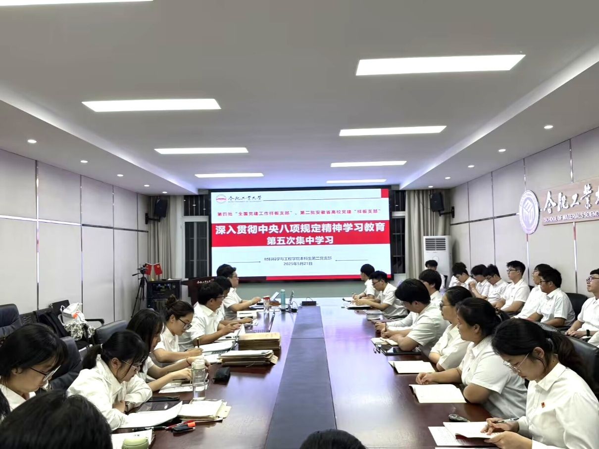 5月21日,全国“样板支部”、材料学院本科生第二党支部在屯溪路校区小红楼210召开了深入贯彻中央八项规定精神学习教育第五次集中学习暨2025年上半年接收预备党员支部大会。党支部相关负责人、全体党员40余人参加本次会议。大会由党支部副书记程振洋主持。