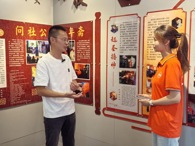 随后,许鑫磊同志带领团队亲自参观和体验傩舞、傩戏道具。成员们通过触摸傩面具、滚灯、五色伞感受到傩文化传递出的人们对美好生活的向往和人与自然和谐共生的智慧。在池州傩戏采风活动结束后,团队成员刘娟对贵池区文化和旅游宣传大使许鑫磊进行了专访。访谈聚焦于如何利用自媒体平台传播池州傩戏及在当今文化浪潮中坚守傩戏传播的意义。许鑫磊就传播傩戏文化需借助主流媒体与自媒体平台谈话,避免让优秀传统文化束之高阁展开,而要贴近人民群众,尤其要关注年轻人群体的文化需求,通过科技手段和潮流元素的融入,使傩戏在新时代焕发光彩。此外,他强调要推动“遗产”变“财产”,在池州傩戏传播过程中重视傩戏传承人的生存与发展问题,为他们提供更好的保障,推动池州傩戏在新时代的传承与创新。