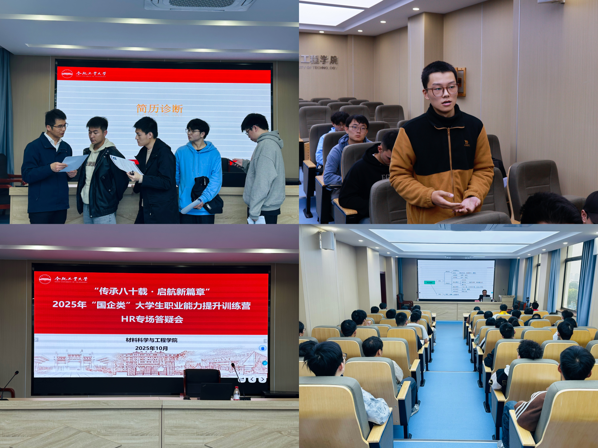 在简历制作与笔试备考工作坊中,主讲老师系统讲解了简历撰写要点与笔试策略。面试技巧报告会上,主讲老师围绕国企面试特点,深入解析了自我介绍与不同类别面试的形式解读与应对技巧。训练营还特邀来自知名企业人力资源部门的招聘负责人主持了HR专场答疑会,从企业招聘视角解答求职困惑,并就职业选择、人岗匹配等话题与学员深入交流;活动现场,嘉宾还对学生的简历进行了现场审阅和点评,并提出了具体修改建议。此外,学员们走进长安合肥公司开展企业参观,通过实地了解生产流程与水果派解说,对国企运营模式和人才需求有了更直观的认识,进一步明确了职业发展方向。
