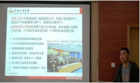 和学院党建概况,并结合党支部建设情况,介绍了学校在持续加强特色支部建设、教师党支部“双带头人”全覆盖、党支部书记述职考核全覆盖、大力推进“教师党支部建设之课程思政”项目等方面的经验。