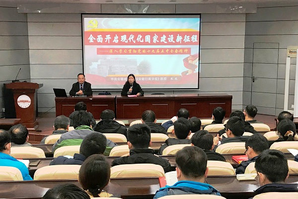 会上,张彪教授以“全面开启现代化国家建设新征程”为主线,从十九届五中全会的主要议程与重大意义、深刻认识与准确把握“五新”重要判断与实践要求、牢牢把握2035年远景目标和“十四五”规划发展目标、坚持党的全面领导为实现“规划”和“远景”目标不懈奋斗四个方面对习近平总书记在党的十九届五中全会上的重要讲话和十九届五中全会精神进行了系统全面深入的解读。报告强调,要从高质量发展、高品质生活、高效率治理三个方面全面把握《中共中央关于制定国民经济和社会发展第十四个五年规划和二〇三五年远景目标的建议》全文逻辑。报告还对安徽省的经济发展情况和材料学科的发展应用前景作了介绍和分析。