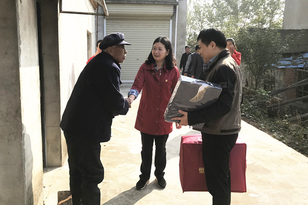 挂职干部朱泉清和村委会负责人的陪同下,扶贫队伍分组入户,为高龄和特困老人,送去“爱心棉被”,关心他们的身体状况和生活情况,为贫困学生送上“爱心书包”和学习用品,鼓励孩子们努力学习、树立理想。