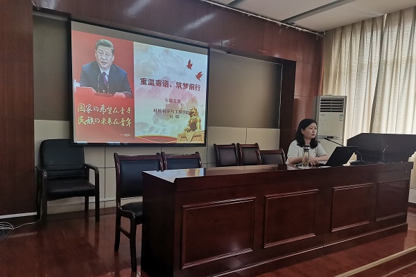 7月30日下午,材料学院《重温寄语、筑梦前行》专题党课在材料楼601报告厅开讲。学院党委书记吕珺结合习近平总书记对青年的寄语以及研究生学习与工作实际,为学院2019级全体研究生党员上专题党课。