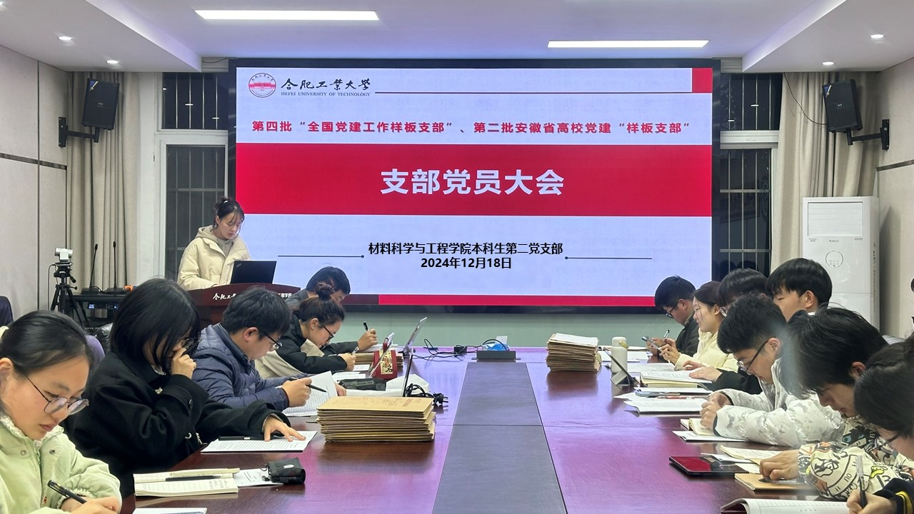 12月18日,全国“样板支部”、材料学院本科生第二党支部在屯溪路校区小红楼210召开了2024年下半年预备党员转正支部大会暨“材料强国”(第一期)专题政治理论学习。大会由党支部副书记程振洋主持,支部全体党员30余人参会。