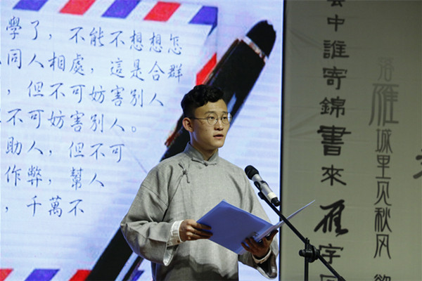 在名人家书品读环节,三名同学声情并茂地为全场师生带来《林则徐家书》《冰心家书》与《胡适家书》选段的品读。合肥广播电视台著名节目主持人、中国播音主持“金话筒”奖获得者柳溪老师与合肥广播电视台播音员管理部主任、《合肥新闻联播》主播王健老师分别品读分享了《龙应台家书》《闻一多家书》节选。在品读亲情环节,材料学院孟令孜同学和她的父亲分享了来往的书信,传达了学生与父母间浓郁的亲情。书信中平淡的语言、真实的情感、殷切的期望、谆谆的告诫感动了全场的观众。在品读师恩环节,材料学院毕业班庞景宇同学在《写给老徐的信》中表达了自己对徐光青老师的感激与爱戴之情。
